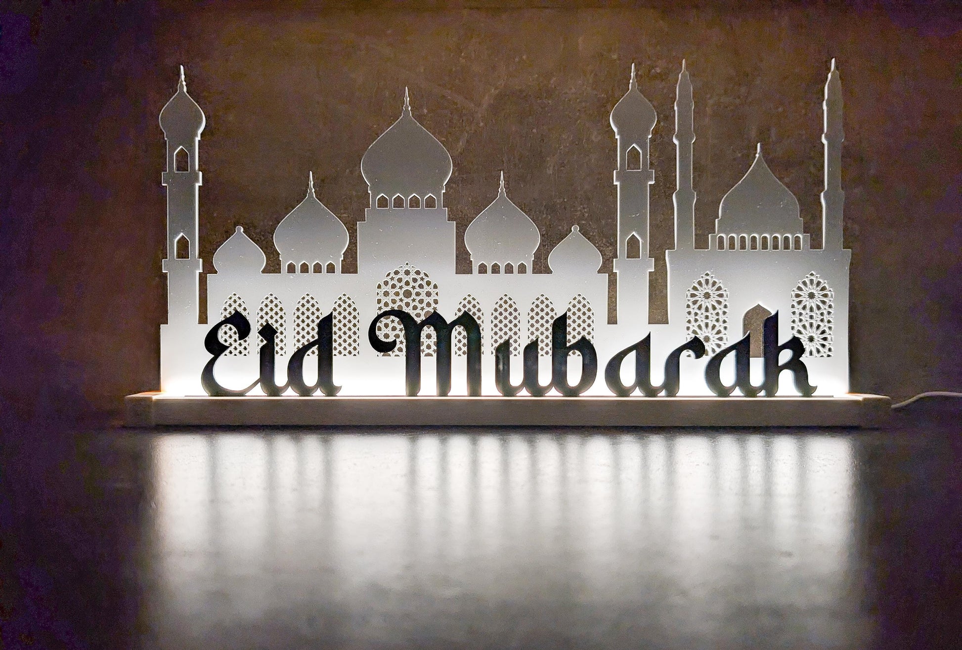 L:53cm, H:25cm, W:4cm. The mosque is made of 3mm recycled, "Eid Mubarak" - 3mm recycled, black acrylic. Each piece uses practical and safe solutions - they have a 100cm cable with a USB plug, come with dimable switch which can be used with any adapter in the world. A perfect gift for someone who appreciates eco friendly, bespoke items!